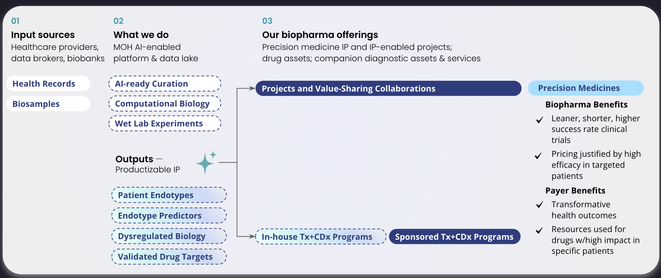 MOH’s platform is built on uniquely curated patient datasets that combine longitudinal medical records with multi-omics data generated from patient samples. Our proprietary AI-driven time-series analytics identify and predict patient endotypes, providing the foundation for discovering targeted therapeutic and diagnostic opportunities.